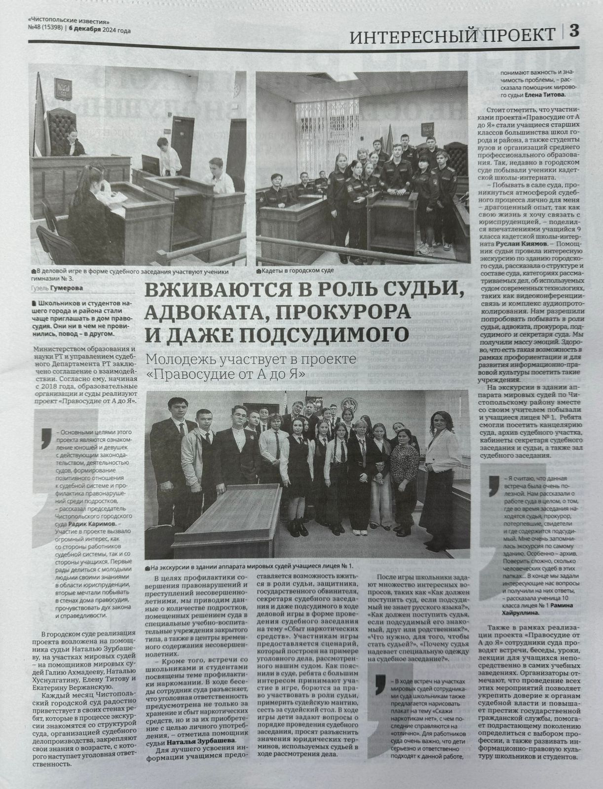 В новом выпуске газеты «Чистопольские известия» опубликована статья о реализации проекта «Правосудие:от А до Я» в стенах суда.![]() |