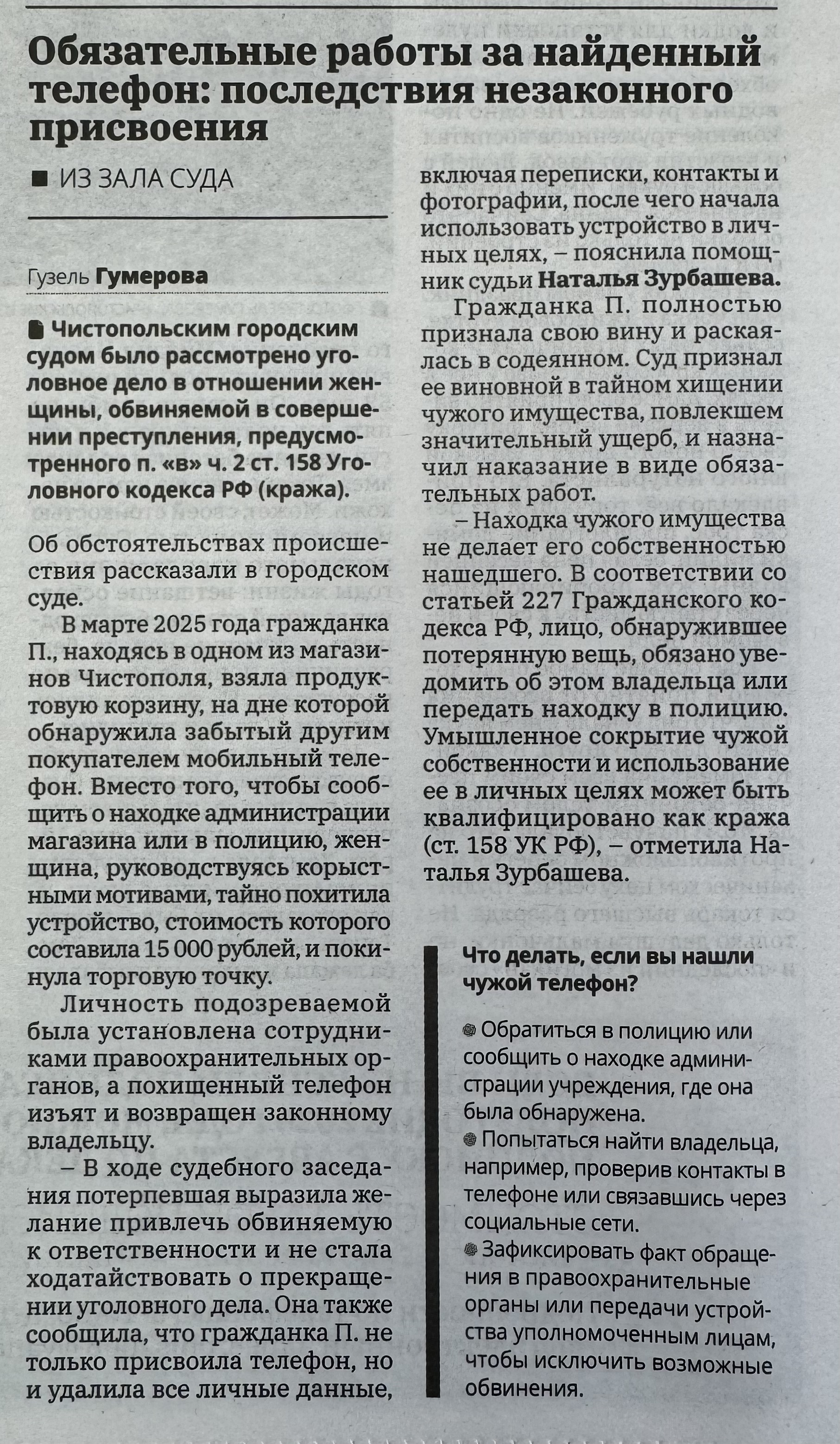 В газете «Чистопольские известия» опубликована статья о рассмотренном в суде деле.![]() |