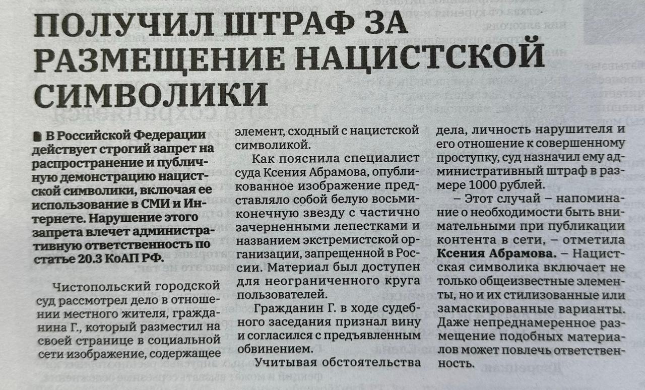 В газете «Чистопольские известия» опубликована статья специалиста суда Абрамовой К.![]() |
