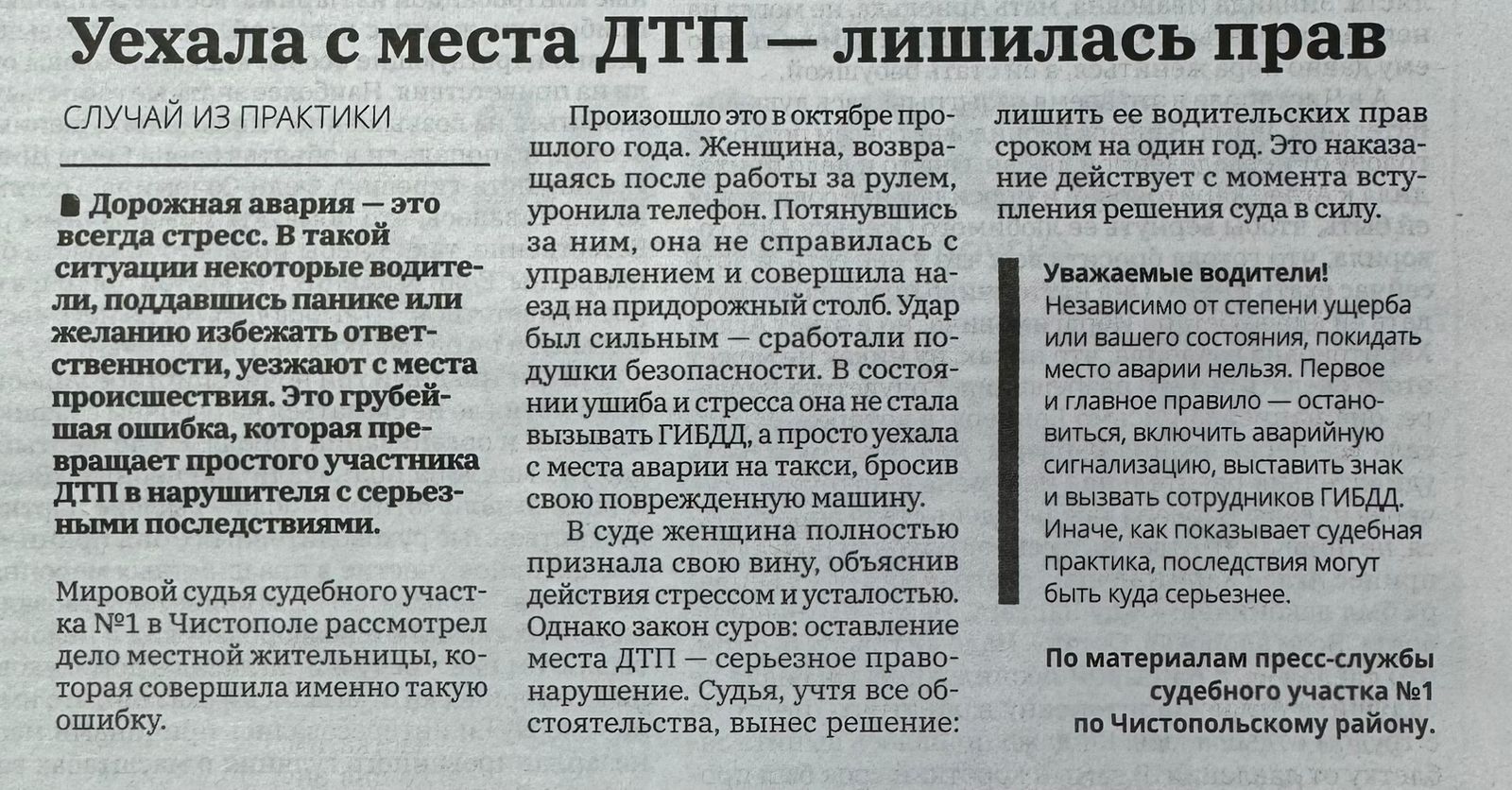 В газете «Чистопольские известия» опубликована статья по делу об оставлении места ДТП ![]() |
